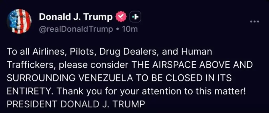 In a post on Truth Social, Donald Trump announced the “total closure” of Venezuelan airspace, urging all international airlines to treat the zone as “completely closed.” He cited combating drug trafficking and human smuggling as justification—yet notably, the U.S. government continues to request special permissions for its own repatriation flights into Caracas, a double standard that Venezuela has fiercely condemned.